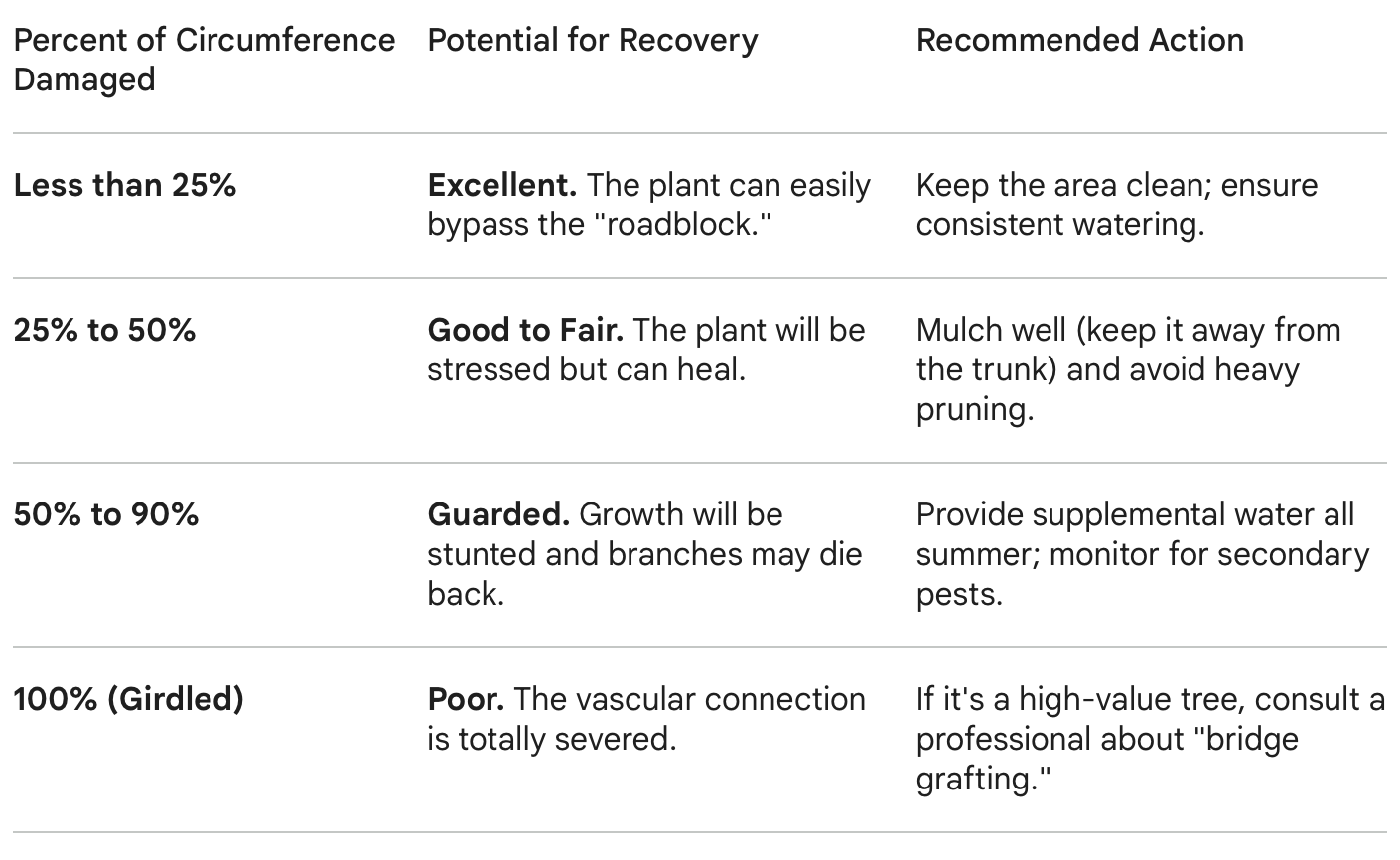 If the damage is partial, a plant may recover over time with some care. But when the bark is removed all the way around the trunk, a condition known as girdling, the flow of water and nutrients is effectively cut off. Without that connection, the plant cannot sustain itself.
